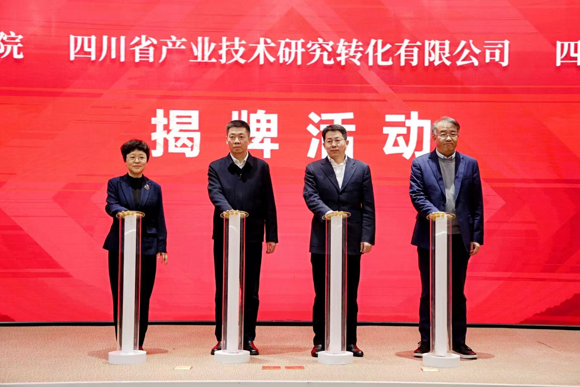 揭牌活动上,省委编办负责同志宣读四川省产业技术研究院、四川省科技人才研究院更名批复文件,省市场监管局负责同志为四川省产业技术研究转化有限公司发放工商登记证书,副省长陈书平,省政府副秘书长杨昕,科技厅厅长路松明,江苏产研院院长刘庆共同为三个单位揭牌。